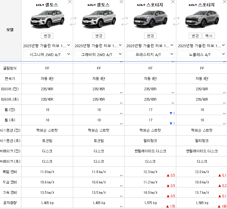 기아 2025 셀토스 vs 2025 스포티지 트림별 비교(가격,제원,성능,크기,연비,기본옵션,선택옵션)