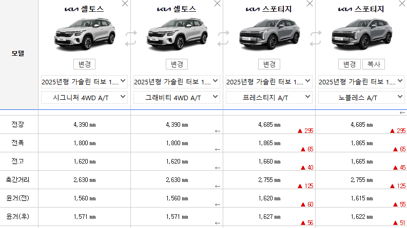 2. 2025 기아 셀토스 VS 2025 기아 스포티지 제원비교