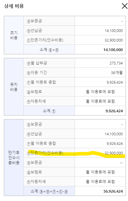 • 인수형 계약: 인수형 계약을 선택하면 잔존가치는 매우 중요해집니다. 잔존가치는 차량의 중고 시세를 예측하여 설정된 금액이기 때문에, 계약 종료 시 중고 시세가 잔존가치보다 높다면, 차량을 인수하여 중고로 판매할 때 이익을 볼 수 있습니다. 예를 들어, 잔존가치가 3000만원이고 중고 시세가 3500만 원이라면, 차량을 인수하여 중고로 판매해도 큰 손해를 보지 않을 것입니다. 반대로, 잔존가치가 3500만 원이고 중고 시세와 비슷하다면, 차량을 인수하는 것이 손해가 될 수 있습니다. 잔존가치는 가능한 낮게 설정되어야 유리합니다.