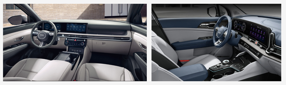 스포티지와 투싼은 각각의 브랜드 특유의 디자인 언어를 반영하고 있습니다. 스포티지는 보다 역동적이고 스포티한 외관을 가지고 있으며, 현대적인 실내 디자인이 특징입니다. 반면, 투싼은 세련되고 날렵한 외관을 자랑하며, 실내 공간은 기능성과 편안함을 중시한 디자인을 가지고 있습니다. 내부 공간 측면에서는 두 모델 모두 넓고 편안한 좌석을 제공하지만, 트렁크 공간과 수납공간에서 약간의 차이가 있을 수 있습니다.