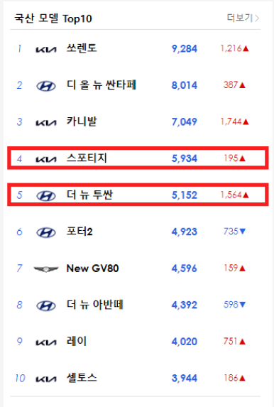 그래서 오늘은 suv 차량중에 가장있기있는 쏘렌토,카니발,싼타페가 아닌 그보다 아래급은 스포티지랑 투싼을 비교해보고자 합니다. 2024년 06월 자동차 판매량 기준으로만 본다면 둘다 5천대이상 출고되면서 05월과 비교해서도 판매량이 늘고 있는 추세입니다. 특히나 스포티지는 원래 꾸준히 4~5천대 팔리는 차량이긴 하지만 투싼이 05월과 비교하면 1,500대이상 증가 하였습니다.
