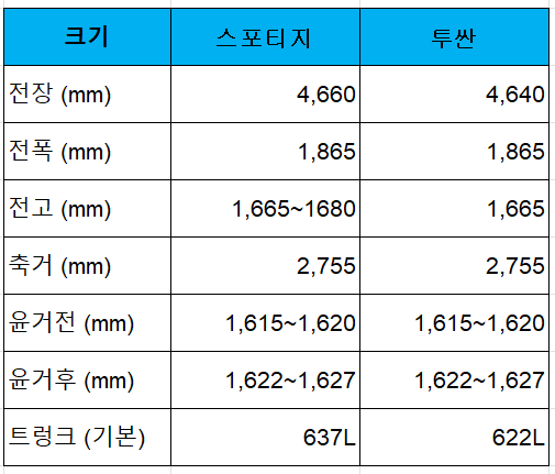 두 모델 모두 같은 프레임을 쓰기 때문에 크기는 거의 비슷합니다. 그래도 조금이라도 큰 차량이나 트렁크공간을 원하신다면 스포티지를 추천 드립니다. 스포티지의 차량 높이나 적재공간이 조금이나마 더 넓기 때문입니다.