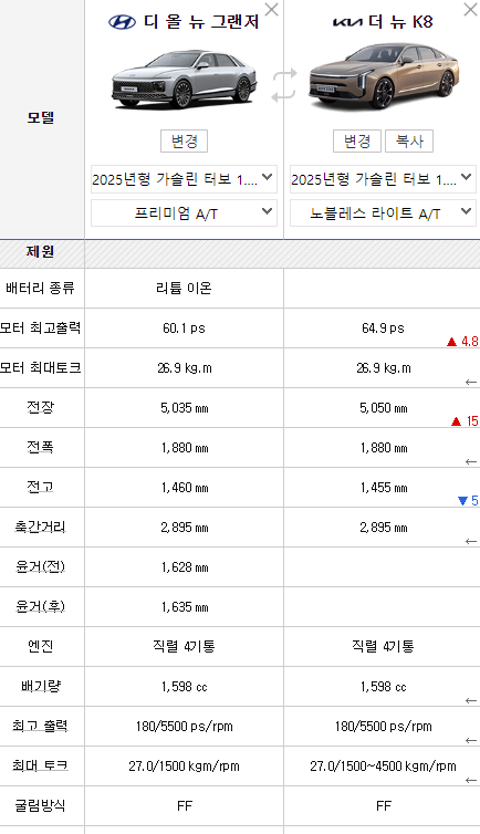 중형세단 2025 기아 더 뉴 K8 vs 2025 현대 그랜저 비교(제원,가격,성능,크기,옵션)