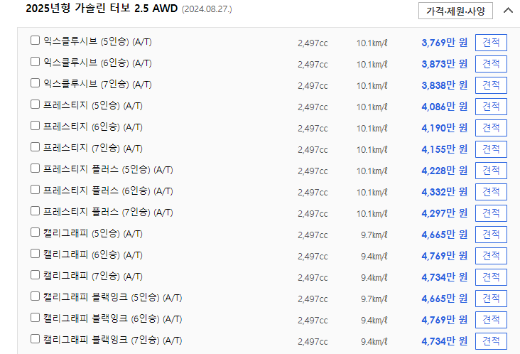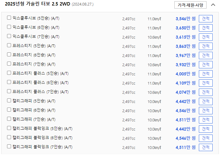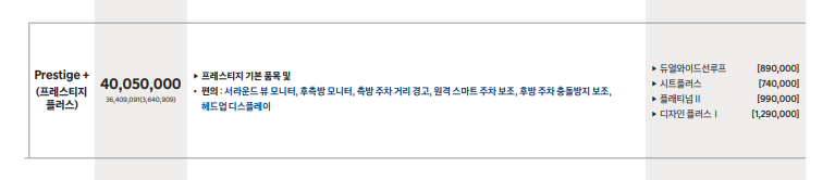 4륜구동 모델의 경우, 프레스티지 플러스 트림이 4,713만 원, 캘리그래피 트림이 5,105만 원으로 가격이 형성되어 있습니다.