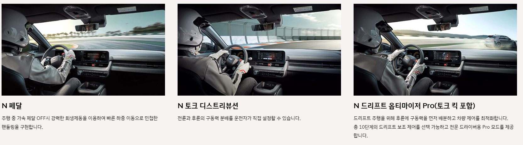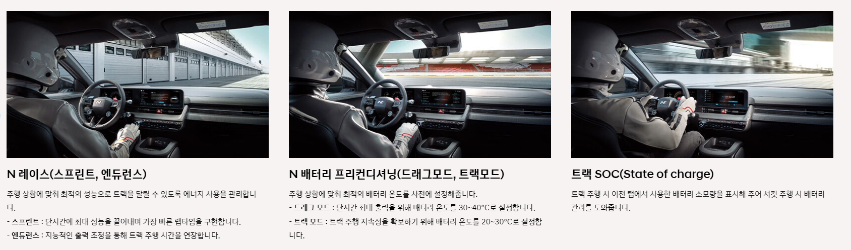 또한 현대차는 'N e-쉬프트' 시스템에 새로운 기능을 추가했습니다. ‘다운 쉬프트 메모리’ 기능은 서킷 주행 중 저단 변속이 허용되지 않는 회전수 이하로 감속되기 전에 변속 명령을 미리 저장해, 허용 회전수에 도달했을 때 변속이 이루어지도록 하는 기능입니다. 이로 인해 서킷 주행 시 보다 정교한 변속이 가능해졌습니다.