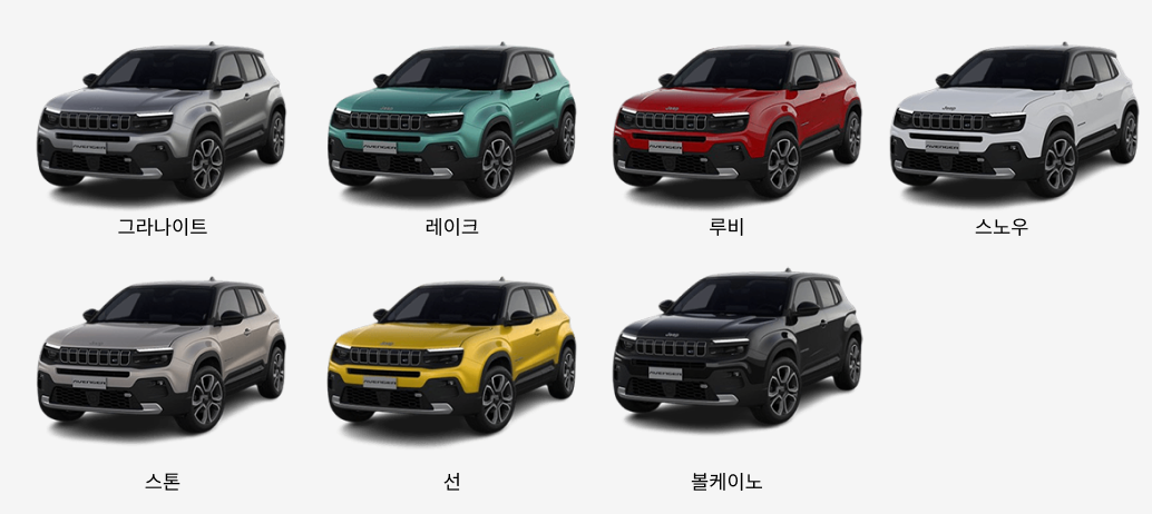 지프 어벤저 EV는 다양한 외장 색상을 제공합니다. 고객의 개성과 취향에 맞게 선택할 수 있는 색상은 다음과 같습니다: