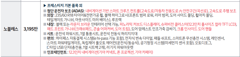 노블레스 옵션에서는 고속도로에서 주행을 편하게 할 수 있도록 안전사양 옵션들이 추가 되었고 내장 디자인 옵션들이 추가 되었습니다.