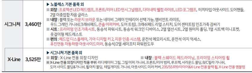 시그니처 옵션의 경우 이미 안전옵션이 노블레스 트림에서 많이 들어갔기 때문에 편의 및 외장 내장 옵션에 힘을 실었습니다. 또한 이번에 새롭게 나온 트림인 X-Line은 기존 30주년 에디션이랑 비슷하게 전용 외장/내장 디자인을 적용 할 수 있습니다.
