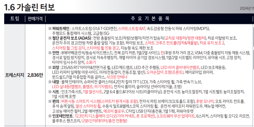 일단 눈에띄는거는 프레스티지 트림에는 2열 열선이 포함되어 있는 컴포트 패키지 안전사양의 더 강화할 수 있는 드라이브와이즈, 주차를 좀더 편하게 해주는 모니터링 패키지가 빠져있습니다. 이 옵션들이 필요하다면 강제적으로 트림을 올려야되는 불편함이 생겼네요. 개인적으로는 안전옵션 만큼은 선택할 수 있게 해도 되지 않았나 싶네요