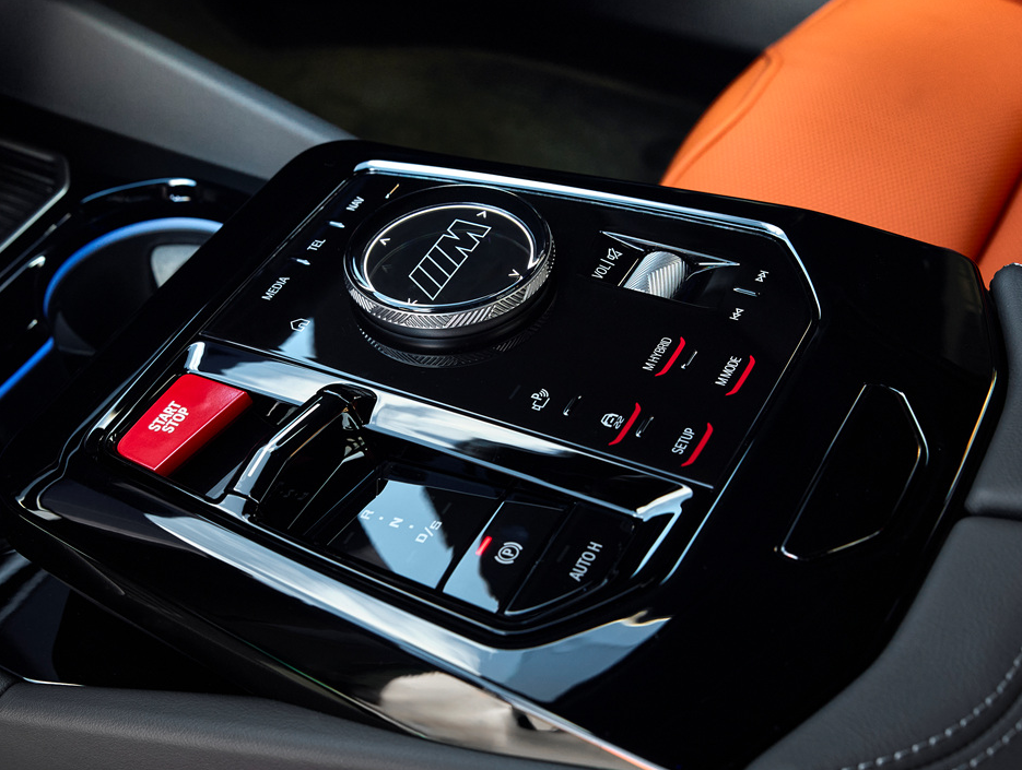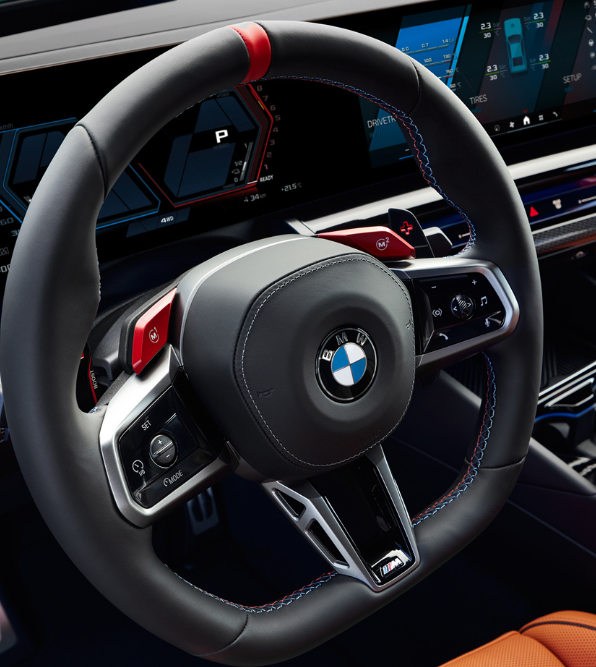 뉴 M5의 계기판과 대시보드는 12.3인치 디지털 계기판과 14.9인치 컨트롤 디스플레이를 일체화한 BMW 커브드 디스플레이가 장식합니다. 여기에 M 전용 UI가 적용되어, 주행 상황에 맞춰 직관적으로 정보를 표시하고, 설정을 쉽게 조절할 수 있도록 해 줍니다. 인터렉션 바 또한 M 디자인으로 꾸며져, 다양한 조명 효과와 함께 감성적인 주행 환경을 만들어냅니다.